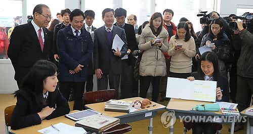 서귀중앙여중에서는 원희룡 제주지사와 이석문 제주교육감이 참석한 가운데 제주도청과 제주도교육청의 자유학기제 업무협약 체결식도 열렸다.(연합뉴스)