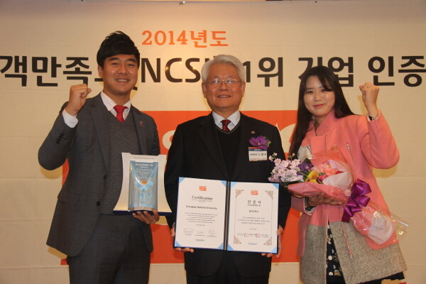 충북대학교(총장 윤여표)가 한국생산성본부에서 주관해 실시한 ‘2014년 국가고객만족도(NCSI) 조사’에서 국립대 부문 1위 기관으로 선정돼 9일 서울 소공동 롯데호텔에서 열린 국가고객만족도 1위 기업 인증 행사에서 인증패를 받았다.