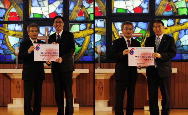 한양제일감리교회(담임목사 김종석) 여선교회와 은혜감리교회(담임목사 서동원)이 15일 목원대학교(총장 박노권)를 방문해 중국 가정교회 출신 학생들에게 2400만원의 장학금을 기탁했다.
