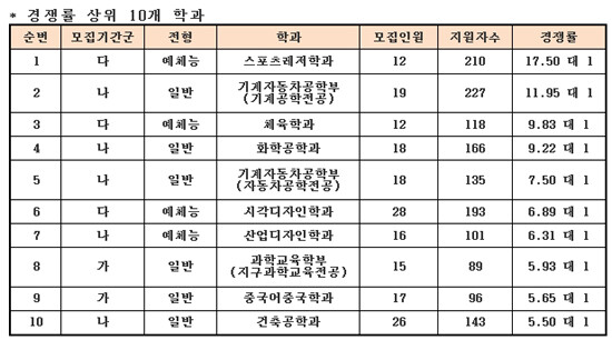 가장 높은 경쟁률을 보인 10개 학과는 스포츠레저학과, 기계·자동차공학부(기계공학전공), 체육학과, 화학공학과, 시각디자인학과, 산업디자인학과, 과학교육학부(지구과학교육전공), 중국어중국학과, 건축공학과 순이었다(표 참조).