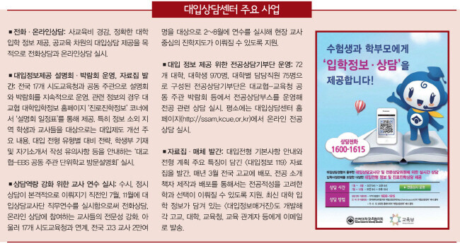 “그동안 대입상담센터의 대입 정보 제공이 주로 교사를 대상으로 이뤄져 수험생 요구를 충족시키는 데 한계가 있었습니다. 이에 사설 입시컨설팅에 의존하려는 학생·학부모에게 보다 적극적인 방법으로 대입정보를 제공하기 위한 변화가 필요하다고 판단하고 있습니다.”