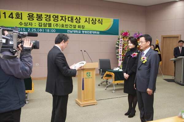 전남대학교(총장 지병문) 경영전문대학원은 25일 교내 용지관 광주은행홀에서 제14회 용봉경영자대상 시상식을 갖고 김상열 ㈜호반건설 회장에게 상패와 메달을 수여했다.