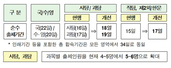 영역별 출제 현황과 특성을 고려, 출제 기간과 인원 보강도 이뤄진다. 현행 수능의 경우 한정된 인원이 제한 기간 동안 문제를 출제함으로써 폐쇄형이라는 지적을 받고 있다. 이에 교육부 수능개선위원회는 탐구영역과 제2외국어/한문영역 출제 기간을 2일씩 확대하고 사회탐구·과학탐구영역 출제 인원을 증원, 출제부담을 완화시킨다는 구상이다.