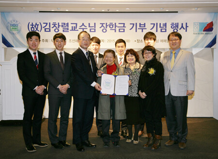 부산대학교(총장 김기섭)와 故 김창렬 교수의 유가족들은 24일 농심호텔에서 조선해양공학과 교수와 동문들이 참석한 가운데 ‘故 김창렬 교수 장학금 기부 기념행사’를 갖고 올해 1월 작고한 故 김 교수의 유지를 받들어 후학 양성을 위한 장학기금 1억 원을 부산대에 전달했다.