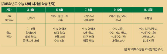 신학기 시작과 함께 2016학년도 대입 일정도 본격적으로 시작됐다. 이에 수험생들에게 필요한 것은 ‘최종 대입합격’을 위한 ‘1년 계획표.’ 무엇보다 ‘대입 농사’의 결정판이라고 할 수 있는 대학수학능력시험(이하 수능)에 대한 대비가 필요하다. <대학저널>이 이투스청솔 교육평가연구소 이종서 소장의 도움말을 빌어 ‘2016학년도 수능 대비 시기별 학습 전략’을 소개한다.