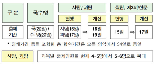 오류 가능성 차단을 위해서는 실전과 유사한 연수를 통해 예비 출제인력풀이 확대된다. 이와 함께 상대적으로 출제진의 부담이 컸던 탐구영역 등의 출제기간과 인원이 보강되고(아래 표 참조) 출제진이 근거자료를 확인할 수 있도록 인터넷 검색 등이 허용된다.