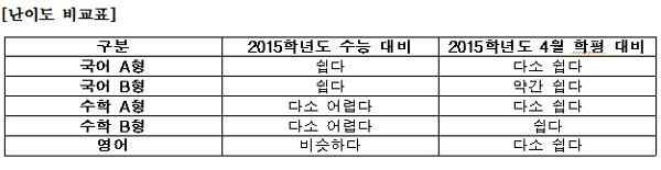 수학 영역 난이도는 A형과 B형 모두 2015 수능보다 다소 어렵게 출제됐다. 2015학년도 수능의 경우 A형 1등급 구분 원점수 96점, B형 100점이었던 것에 반해 이번 4월 학력평가는 수학 A형 1등급 구분 원점수 89점, B형 92점으로 예상된다.