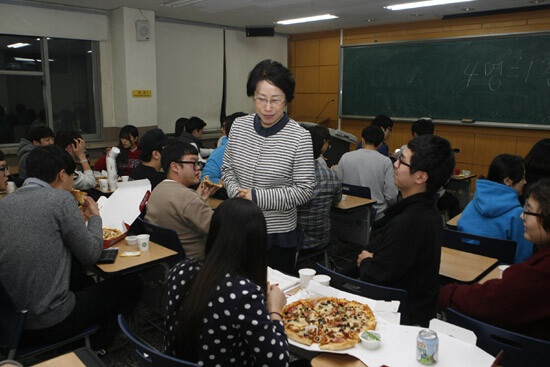 이날 최 총장은 중간고사 준비에 한창인 학생들을 만나 '힘내서 시험을 잘 보길 바란다'는 응원과 함께 일일이 인사를 건네며 피자를 나눠줬다.