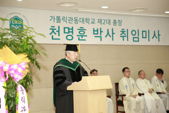 가톨릭관동대는 15일 청송관 대강당에서 제2대 총장 천명훈 박사 취임식을 개최했다.
