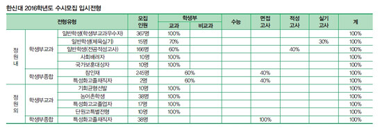 “한신대는 2016학년도 수시모집에서 정원 내 815명, 정원 외 113명 총 928명을 모집한다. 전형은 크게 ‘학생부교과’와 ‘학생부종합’으로 분류된다. 세부 모집방식은 아래 표와 같다.