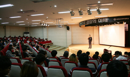 이번 특강에는 충북보건과학대 경찰행정학과, 부사관과, 건설정보부사관과, 정보통신부사관과 재학생 200여 명이 참석했다. 윤 청장은 이날 특강에서 우리나라 경찰 조직과 역할을 소개했다.