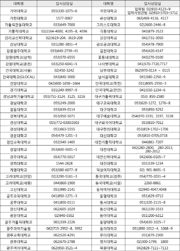 대교협은 "사교육비 경감, 정확한 대학 입학 정보 제공을 위해 '대입상담센터'를 연중 운영하고 있다"면서 "다음달 9일부터 시작되는 수시모집 지원을 앞두고 '특별상담주간'을 설정, 수험생들을 위한 상담시간을 확대한다"고 20일 밝혔다.