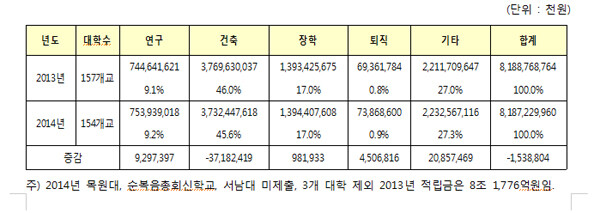 국회 교육문화체육관광위원회 소속 정진후 의원(정의당)이 한국사학진흥재단으로부터 전국 154개 4년제 사립대의 2014년 결산자료를 받아 분석한 결과 사립대들이 보유한 적립금은 총 8조 1872억 원에 달했다. 2013년의 경우 157개교에서 총 8조 1887억 원을 보유했다.