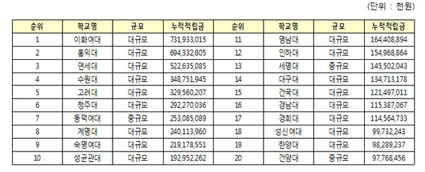 이화여대가 사립대 가운데 가장 많은 적립금을 보유하고 있는 것으로 나타났다. 이어 홍익대와 연세대도 많은 적립금을 보유하고 있는 대학으로 꼽혔다.