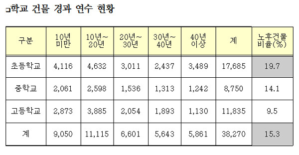 국회 교육문화체육관광위원회 소속 박인숙 의원(새누리당·송파구갑)이 교육부로부터 제출받은 자료에 따르면 전체 초등학교 건물 1만 7685동 중 3489동의 건물이 40년 이상 노후건물로 밝혀졌다. 이는 전체 초등학교 건물의 19.7%에 해당되는 수치다. 초·중·고등학교 건물 전체를 봐도 3만 8270개동 중 15.3%인 5861개동이 40년 이상된 노후건물이었다.