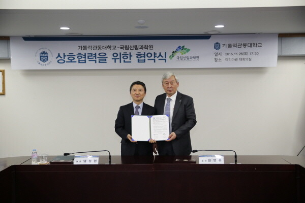 가톨릭관동대는 지난 26일 교내 마리아관 대회의실에서 국립산림과학원(원장 남성현)과 상호협력을 위한 협약을 체결했다.
