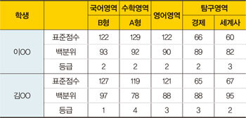 정시모집 전형요소와 관련, 한 가지 유의해야 할 사항이 있습니다. 수능의 경우 단순히 4개 영역의 합산으로 지원 대학을 결정하면 안 된다는 것입니다. 다시 말해 수능 성적은 반영지표, 반영영역, 반영비율, 가산점 등에 따라 유·불리가 달라지기 때문에 이를 면밀히 살펴봐야 합니다. 예를 들어 수능성적표를 아래와 같이 받은 이OO 학생과 김OO 학생이 동시에 A대학과 B대학에 지원하면 유·불리가 달라집니다.