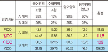 실제 국어 35%, 수학 15%, 영어 30%, 탐구 20%를 반영하는 A 대학과 국어 25%, 수학 25%, 영어 25%, 탐구 25%를 반영하는 B 대학의 환산점수를 살펴보면 A 대학은 김OO 학생이 유리하고 B 대학은 이OO 학생이 유리합니다.