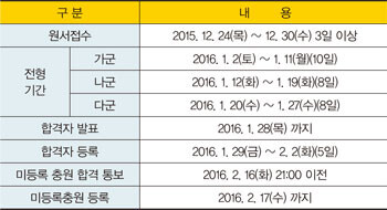 2016학년도 정시모집 원서접수는 ‘모집 군’에 상관없이 12월 24일부터 12월 30일까지 대학별로 3일 이상 실시되며 정시모집 전형은 2016년 1월 2일부터 1월 27일까지 ‘모집 군’별로 진행됩니다.