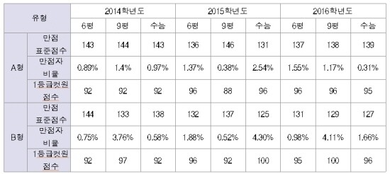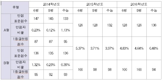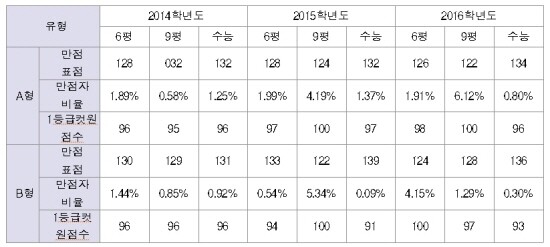 만점자 비율이 국어A형 0.80%(전년도 1.37%), 국어B형 0.30%(전년도 0.09%), 수학A형 0.31%(전년도 2.54%), 수학B형 1.66%(전년도 4.30%), 영어 0.48%(전년도 3.37%)로 전 영역에 걸쳐 지난해보다 현저히 낮게 나타나 지난해보다 어려운 수능이었던 것을 알 수 있다. 다만 국어B형만 지난해보다 약 3배 늘어났다.