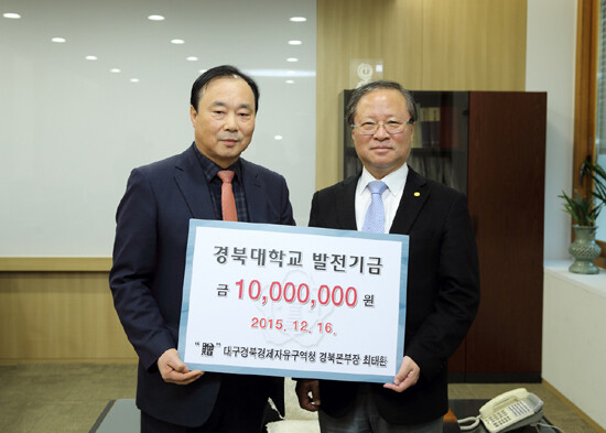 경북대학교(총장 직무대리 손동철) 농화학과 75학번 최태환 동문(대구경북경제자유구역청 경북본부장)이 16일 손동철 경북대 총장 직무대리를 방문해 발전기금 1000만 원을 전달했다.