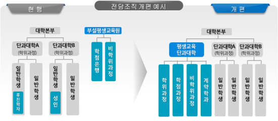 교육부는 이러한 문제점을 해소하고자 지난 5월 26일 '대학의 성인 전담 평생교육 단과대학 개편시안'을 발표했으며 최종계획을 확정지었다.