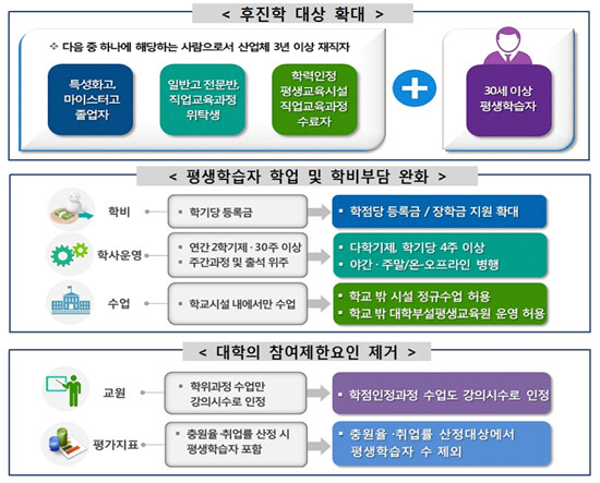 학업·학비 부담도 완화된다. ▲학기별 이수학점 제한 개선 ▲다학기제 운영 ▲야간·주말과정 수업 ▲원격·블렌디드 러닝 등 학사관리 및 수업방식이 평생학습자 중심으로 운영된다. 등록금은 학점별 납부가 가능해지며 국가장학금Ⅱ유형 우선 지원과 같은 혜택이 부여된다.
