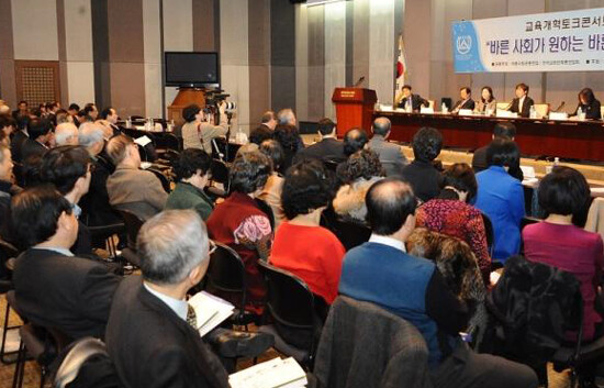 먼저 신영무 바른사회운동연합(이하 바사연) 상임대표는 정치권이 총선 공약으로 교육개혁위원회 구성을 제시해 달라고 요청했다. 신 대표는 바사연과 한국교원단체총연합회(이하 교총)가 2015년 12월 공동 개최한 '교육개혁 토크콘서트'에서 개인의 능력과 자질 계발 극대화 등 바사연의 교육 3대 원칙을 발표하고 범정권적·초정파적 교육개혁위원회의 필요성을 역설했다.