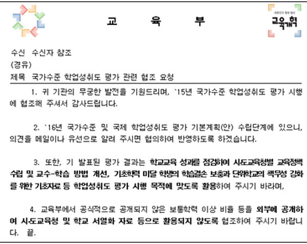 이는 '학교와 교육청을 서열화하는 것을 방지하기 위해 보통학력 이상 비율 자료는 공개하지 않는다'라고 밝힌 교육부의 답변에 위배되는 셈이다. 이에 교육부도 사교육걱정의 주장을 인정, 학업성취도 결과를 이용, 학교 서열화 조장 가능성이 있는 홍보를 못하도록 조치한 것으로 보인다.