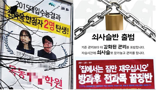 학벌주의와 선행교육을 조장하는 대학 합격 현수막을 근절하기 위해 교육기관은 물론 시민단체까지 나섰다.