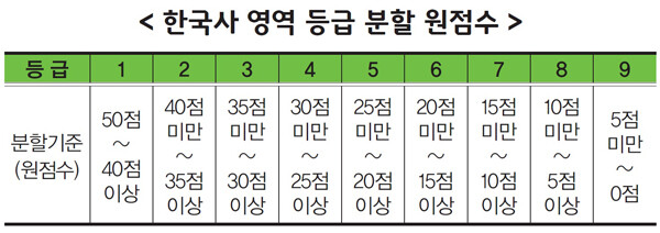 문항 수는 20문항이고 시험시간은 30분입니다. 특히 한국사 영역은 다른 영역과 달리 절대평가에 따른 등급만 제공됩니다. 한국사 영역의 만점은 50점으로 등급 분할 원점수는 1등급과 2등급의 분할점수인 40점을 기준으로 5점씩 낮아집니다.