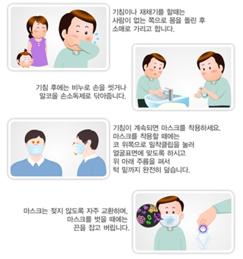 "기침이나 재채기를 할 때 휴지나 손수건 등으로 입과 코를 가리세요."