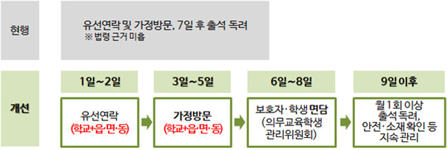 만일 소재·안전이 확인되지 않으면 경찰에 수사가 의뢰된다. 특히 교육부는 경찰 수사 의뢰 시점을 당초 3일차에서 2일차로 단축했다. 이는 3일차부터 경찰에 수사를 의뢰할 경우 대처가 늦을 수 있다는 지적 때문이다.