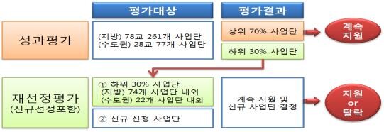 이어 7월 성과평가 결과 하위 30% 사업단과 새로 신청한 사업단을 대상으로 재선정평가를 한 뒤 9월 최종 지원대상을 선정한다.