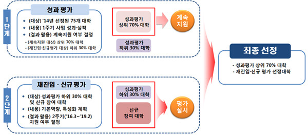 교육부 관계자는 "계속지원 대상 대학들은 2년 동안 사업을 수행하며 NCS 기반 교육과정을 활용, 사회·산업 수요 맞춤형 전문인력 양성 측면에서 상당한 성과를 창출했다"면서 "향후 재진입·신규평가도 성과평가와 같이 공정성에 우선순위를 두고 엄정하게 진행할 것"이라고 밝혔다.