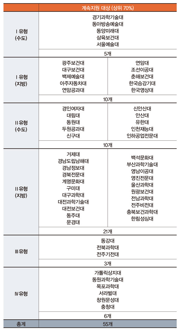 계속지원 대상 전문대학은 ▲Ⅰ유형- 경기과기대·동아방송예대·동양미래대·삼육보건대·서울예대(이상 수도권), 광주보건대·대구보건대·백제예대·아주자동차대학·연암공대·연암대·조선이공대·춘해보건대·한국승강기대·한국영상대(이상 지방) ▲Ⅱ유형- 경인여대·대림대·동원대·두원공대·신구대·신안산대·안산대·유한대·인천재능대·인하공전(이상 수도권), 거제대·경남도립남해대·경남정보대·경북전문대·계명문화대·구미대·대구과학대·대전과기대·대전보건대·동주대·문경대·백석문화대·부산과기대·영남이공대·영진전문대·울산과학대·원광보건대·전남과학대·전주비전대·충북보건과학대·한림성심대(이상 지방) ▲Ⅲ유형- 동강대·전북과학대·전주기전대 ▲Ⅳ유형- 가톨릭상지대·동원과기대·목포과학대·서라벌대·창원문성대·충청대다.