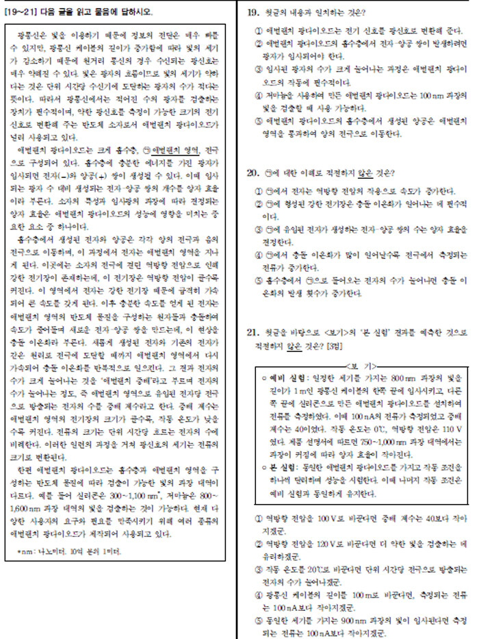 앞서 서 씨 등이 지난 2월 소송을 제기한 국어 영역 A형 19번 문항의 경우 애벌랜치 광다이오드 관련 지문을 읽고 지문 내용과 일치된 답안을 선택하는 문제다. 당시 평가원은 정답으로 ②번('애벌랜치 광다이오드의 흡수층에서 전자-양공 쌍이 발생하려면 광자가 입자돼야 한다')을 제시했다.