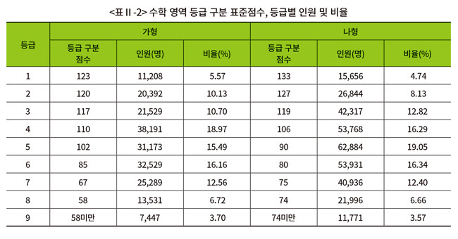 수학영역 등급 구분 표준점수와 등급별 인원 및 비율은 표와 같이 나타났다. 1등급과 2등급을 구분하는 등급 구분 표준점수는 가형 123점, 나형 133점이다.