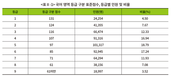 국어영역 등급 구분 표준점수와 등급별 인원 및 비율은 표와 같이 나타났다. 1등급과 2등급을 구분하는 등급 구분 표준점수는 131점이다.
