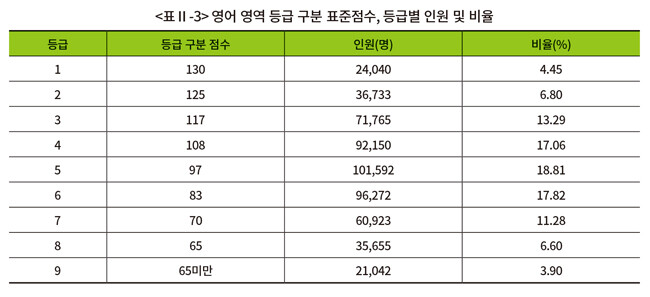영어영역 등급 구분 표준점수와 등급별 인원 및 비율은 표와 같이 나타났다. 1등급과 2등급을 구분하는 등급 구분 표준점수는 130점이다.