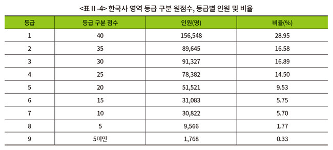 한국사영역 등급 구분 표준점수와 등급별 인원 및 비율은 표와 같이 나타났다. 1등급과 2등급을 구분하는 등급 구분 표준점수는 40점이다.