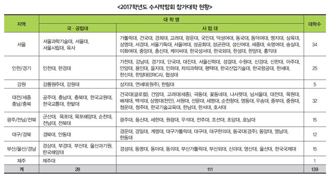 "이번 수시박람회에는 전국에서 139개 대학이 참가합니다. 이는 지난해 137개 대학보다 증가한 수치입니다. 수시박람회 참가 대학은 매년 증가하고 있습니다. 자세한 참가 대학 명단은 아래의 표를 참고하시기 바랍니다."