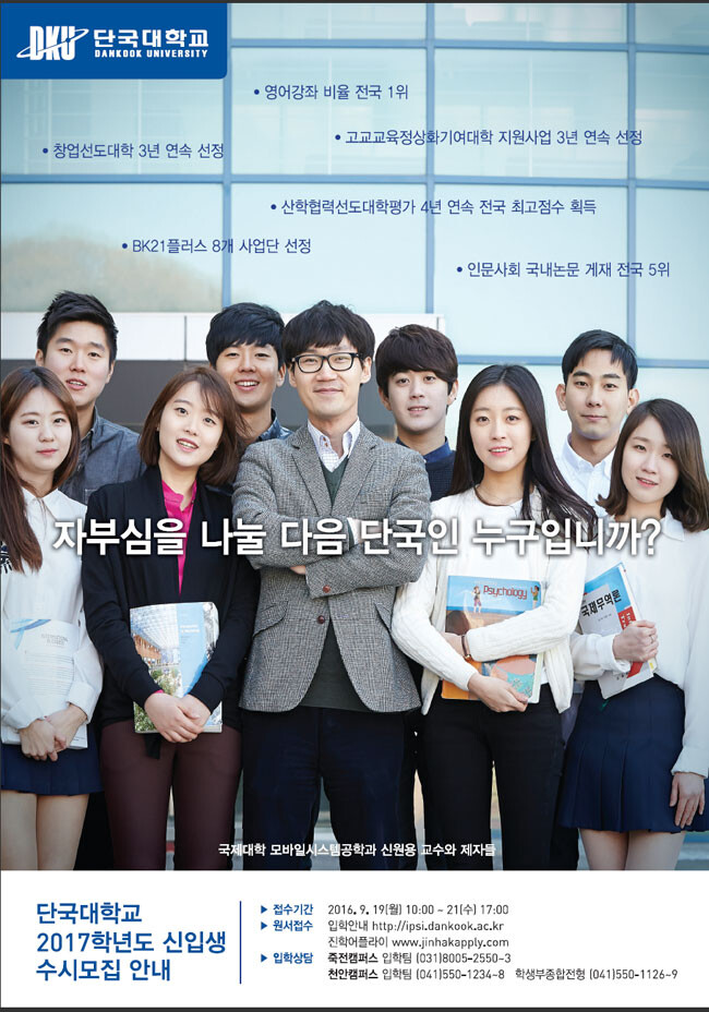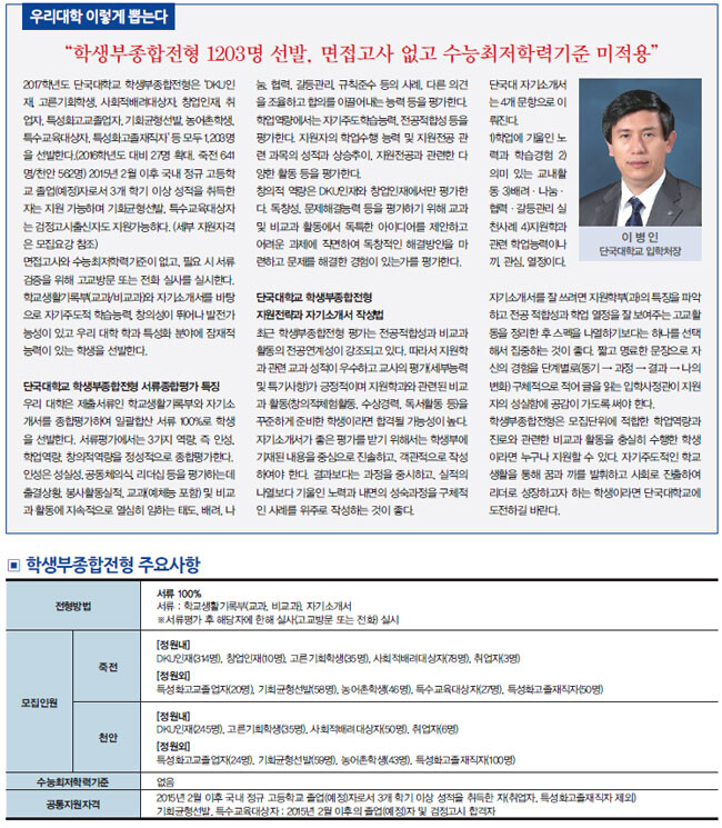 ‘고교교육 정상화 기여대학 지원사업’은 고교교육이 중심이 되는 대입전형을 운영하고 입학사정관 확충 등 대입전형 운영 역량을 강화한 대학을 지원하는 사업이다. 단국대는 2014년 해당 사업이 처음 시작됐을 때부터 올해까지 3년 연속 선정됐으며 올해는 전국에서 선발된 60개 대학 가운데 6위에 해당하는 지원금 13억 4000만 원을 받는다. 단국대는 고른기회 입학전형 모집인원을 지속적으로 확대하고 해당 입학전형 입학생들을 위한 추수관리 프로그램을 다양하게 운영하는 대학으로 평가받고 있다.