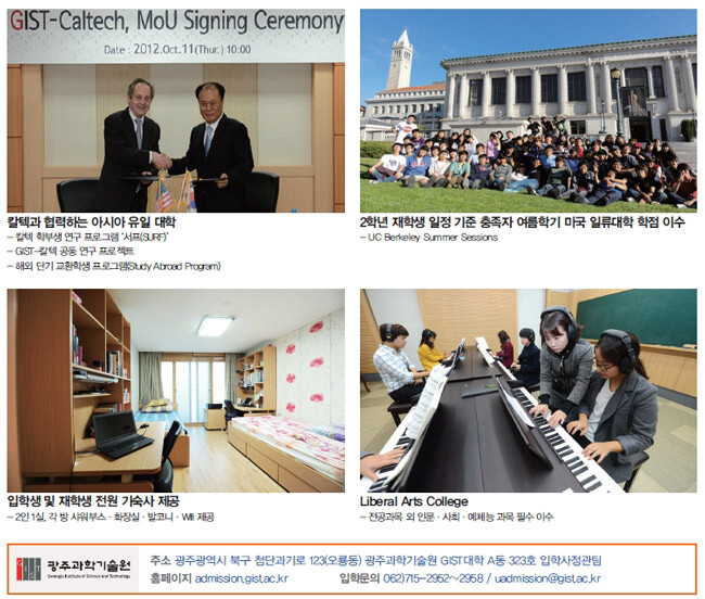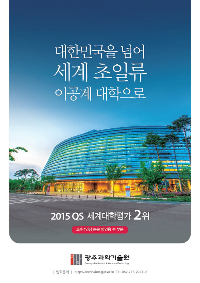 1993년 설립, 올해로 23주년을 맞은 GIST(Gwangju Institute of Science and Technology)는 짧은 시간에도 불구하고 연구 인프라와 노하우를 바탕으로 우리나라를 대표하는 이공계 연구중심대학으로 성장했습니다. 2015년 영국 글로벌 대학평가기관인 QS(Quacquarelli Symonds)가 실시한 세계대학평가에서 '교수 1인당 논문 피인용 수' 부분 세계 2위로 평가됐으며, 2014년 THE(Times Higher Education) 세계대학평가에서는 '공학·기술'분야 국내 4위, 세계 96위를 기록했습니다. 이는 GIST의 학문적 성과와 연구 수준이 세계 명문 대학과 견주어 손색이 없다는 증거입니다.