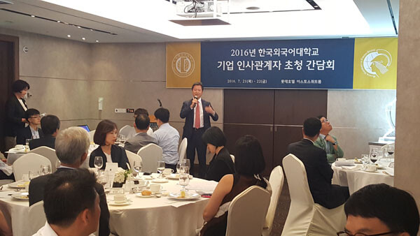 한국외대 진로취업지원센터는 지난 21일부터 22일까지 소공동 롯데호텔 아스토스위트룸에서 '2016년 기업인사관계자 초청 간담회'를 개최했다. 간담회에는 한국 대기업 및 중소기업과 외국계기업 등 56개 기업에서 58명의 기업 인사부서 책임자 및 관계자가 참석했다. 21일에는 주요 대기업, 공기업 22일에는 외국계기업, 중견기업 인사부서 책임자가 초청됐다.