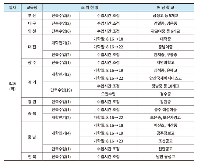 17일 교육부에 따르면 지난 16일 기준 총 2254개교(초등학교 82개교, 중학교 723개교, 고등학교 1449개교)가 개학했다. 이 가운데 폭염 주의보와 폭염 경보에 따라 11개교가 개학을 연기했다. 38개교는 단축수업에 들어갔다. 폭염 주의보는 일 최고 기온 33℃ 이상 상태가 2일 이상 지속 예상되면 발령된다. 또한 폭염 경보는 일 최고 기온 35℃ 이상 상태가 2일 이상 지속 예상되면 발령된다.