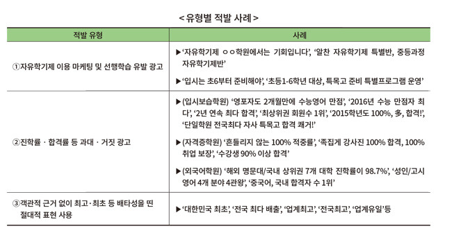 교육부와 공정거래위원회(이하 공정위)는 학원 등의 과대·거짓광고 모니터링과 점검 결과를 24일 발표했다. 교육부와 공정위는 "이번 모니터링은 자유학기제 이용 마케팅, 선행학습 유발 등 학생·학부모의 불안감 조장 광고 적발에 초점을 맞췄다"면서 "특히 객관적 근거 없이 실적을 부풀린 과대·거짓 광고, 수강료 환불 거부 등 불공정 행위에 대해서도 집중 점검했다"고 설명했다.