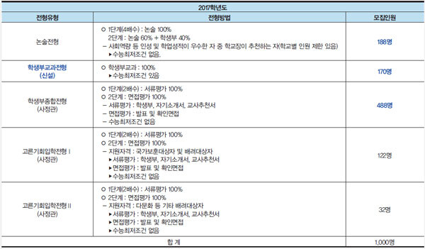 신설된 학생부교과전형은 수능최저조건이 있으며 전형방법은 학생부교과 100%로 선발하며 학년별 반영비율은 없다. 학생부종합전형의 모집인원은 403명에서 488명으로 증가됐다. 논술전형은 학교장 추천제로 실시되는데 3학년 정원의 3%(졸업생 0.5%)로 고교별 지원인원에 제한이 있다. 2017학년도부터 신설되는 융합전공학부는 기존의 자유전공학부와 융합전공학부가 자유융합대학을 이뤄 하나의 단과대학을 구성한다. 융합전공학부 소속 학생들은 기존의 일반전공 하나와 2개 이상의 학부 교과과정으로 구성된 통섭 전공 하나를 복수전공의 형태로 이수하게 된다. 융합전공학부는 학생부종합전형으로만 18명을 선발한다.