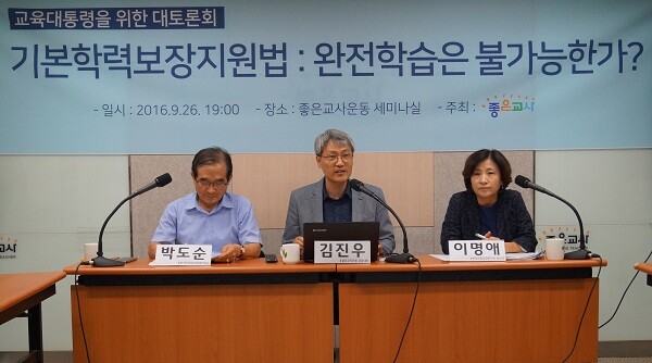 첫 번째 대토론회에서 김진우 좋은교사운동 공동대표는 "기본학력은 학생이 졸업한 뒤 10년, 20년 후에도 유의미한 지식과 능력이 돼야 하고 정상적 학습능력을 지닌 학생들이 성취 가능한 수준으로 설정돼야 한다"면서 "이에 기본학력보장지원법을 통해 기본학력과 완전학습 개념에 기초한 교육과정의 적정화를 해야 하고 개인맞춤형 학습에 기초한 교실수업 개선과 절대평가체제를 통해 모든 학생들이 기본학력을 보장받을 수 있도록 해야 한다"고 제안했다.