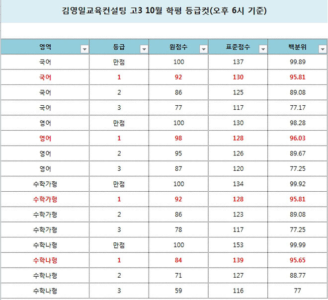 [대학저널 신효송 기자] 김영일교육컨설팅이 11일 고등학교 3학년을 대상으로 실시한 '2016년 전국연합학력평가' 등급컷을 공개했다.